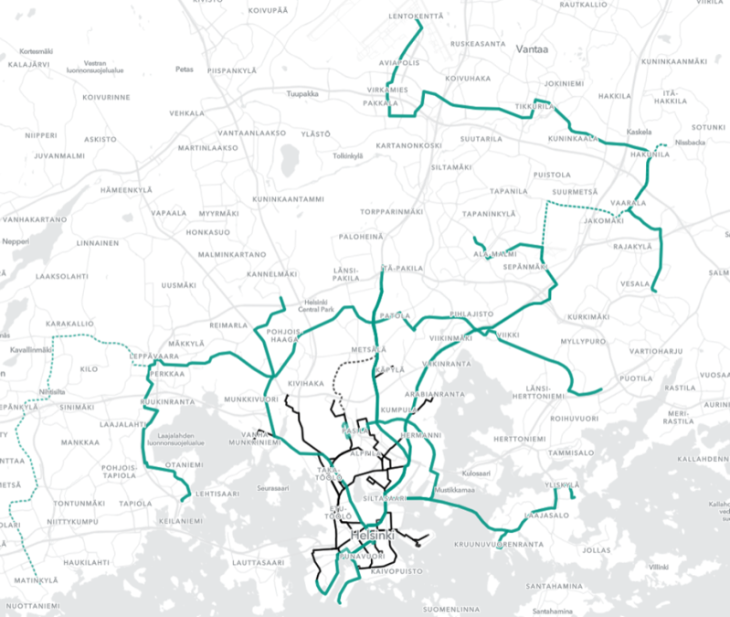 | Väylän ominaisuudet | Nopeita ja suurikapasiteettisia raitiolinjoja omilla korkealuokkaisilla väylillään | Helsingin perinteisten raitiolinjojen kaltaisia raitiolinjoja, kuitenkin nykyaikaisesti toteutettuina. |