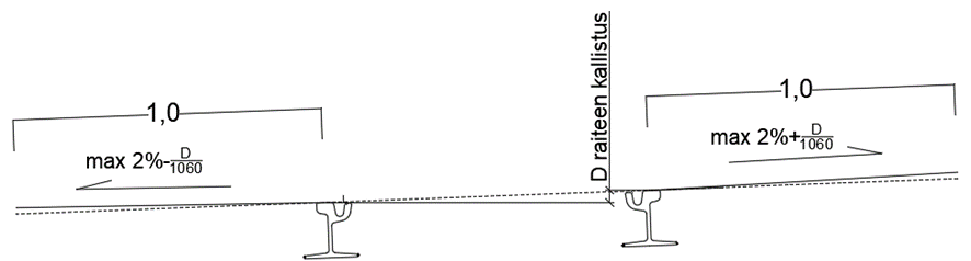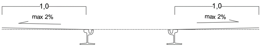 Suljettujen ratarakenteiden poikkileikkauksen suunnittelussa tulee huomioida, että päällystemateriaalit saavat metrin päässä raiteen ajopinnasta nousta enintään 2 cm, eli 2%.