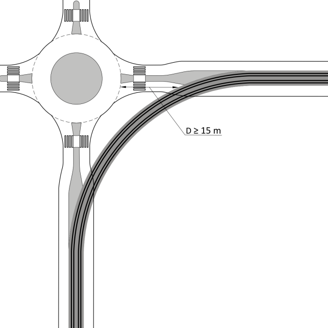 Raitiovaunun kääntyessä kiertoliittymän vieressä kuvan 13 mukaisesti ylittää raitiotie kiertoliittymän kaksi haaraa osittain. Raitiotie on sijoitettava tarpeeksi kauas kiertoliittymästä, jotta siitä poistuvalle ajoneuvon kuljettajalle mahdollisestaan 1–2 sekunnin reaktioaika raitiotien kohtaamiseen. Loivasti kääntyvän radan risteämisiskulmia raitiotien kanssa voi myös olla haastavaa saada riittävän suuriksi.