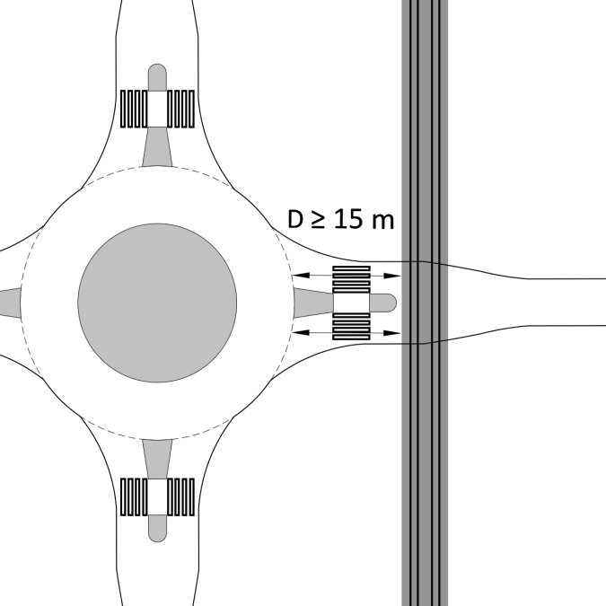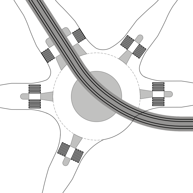 Jos raitiotie sijaitsee kiertoliittymän sivussa kuvan 14 mukaisesti, ei vuorovaikutusta muuhun ajoneuvoliikenteeseen ole. Näissä tapauksissa on kuitenkin kiinnitettävä erityistä huomiota jalankulkijoiden ja pyöräilijöiden reitteihin ja ylityspaikkoihin.
