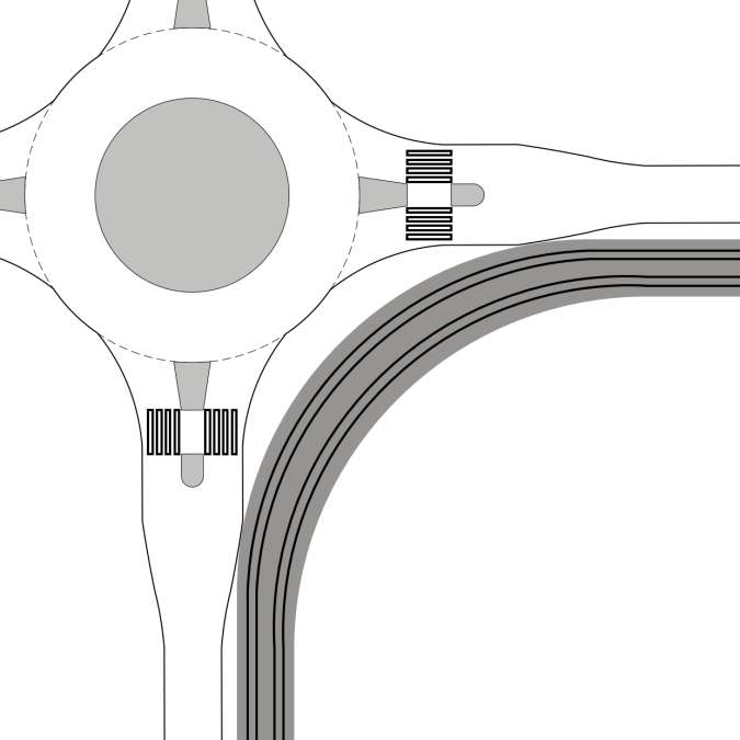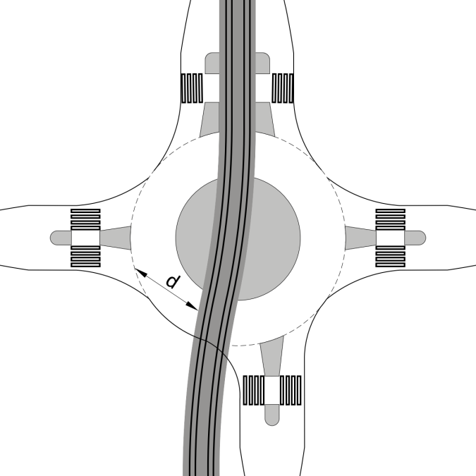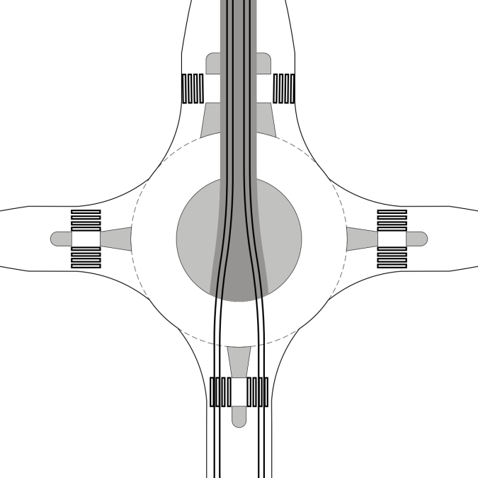Kiertoliittymän läpi kulkevien raiteiden tulisi olla mahdollisimman suorat. Suorat raiteet ovat ajoneuvojen kuljettajille selkeimpiä.