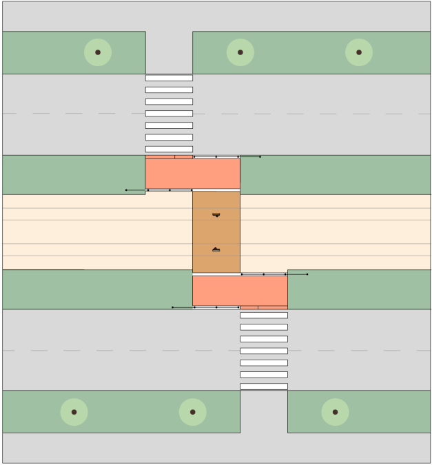 Liittymissä raitiotien ja ajoratojen välille tulisi aina mahtua riittävät saarekkeet jalankulkijoiden odotustiloiksi. Saarekkeet mahdollistavat jalankulkijoiden ylitysten jakamisen niin, ettei kadun yli muodostu liian pitkää yhtenäistä ylitystä. Myös liikennevalo-ohjauksen tehokas toteuttaminen vaatii saarekkeita. Saarekkeet mahdollistavat tarvittaessa myös ylityksen porrastamisen. Porrastaminen saattaa vaatii mahdollisesti lisätilaa.