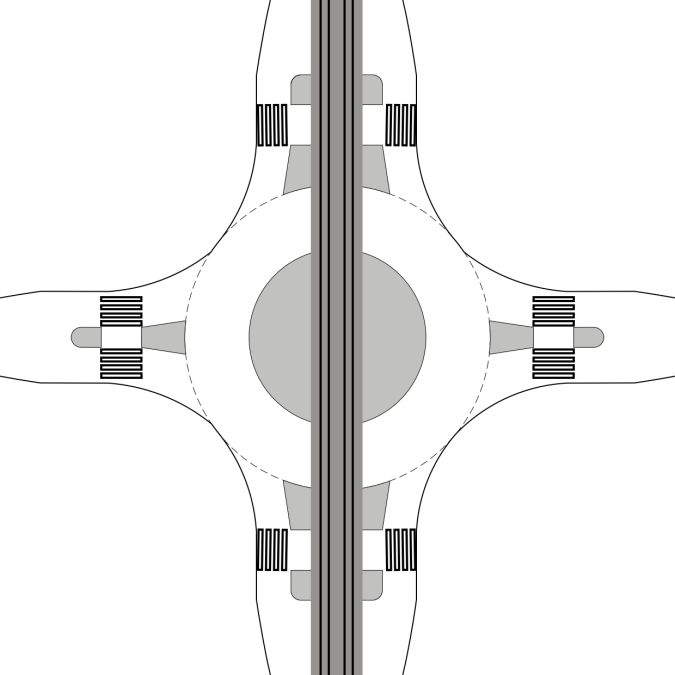 Raitiotien tulisi ylittää kiertoliittymä ensisijaisesti keskisaarekkeen läpi. Vaihtoehtoisesti raitiotien linjaus tulisi viedä selkeästi kiertoliittymän ulkopuolelle.