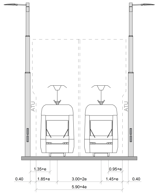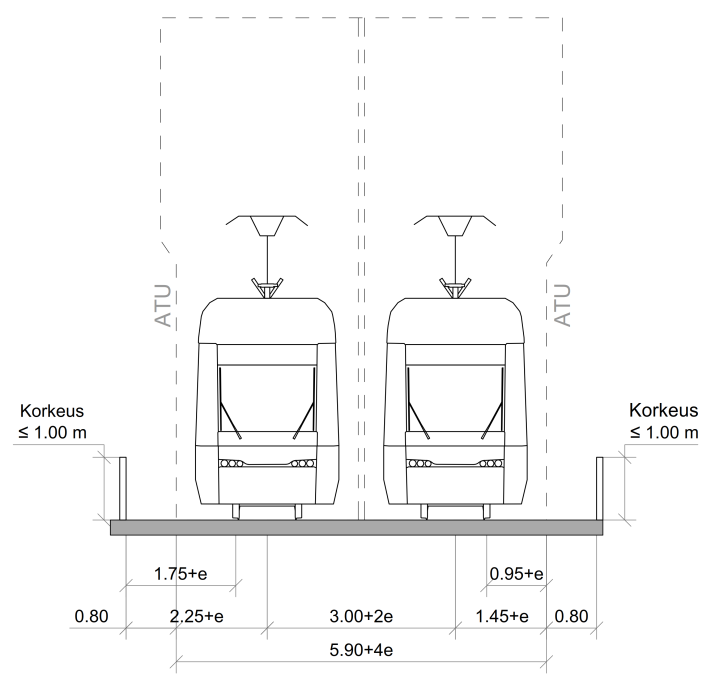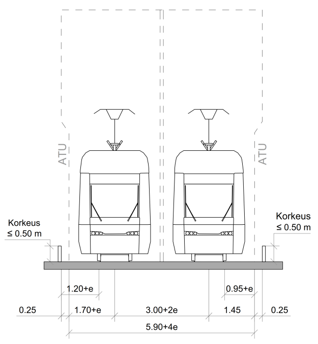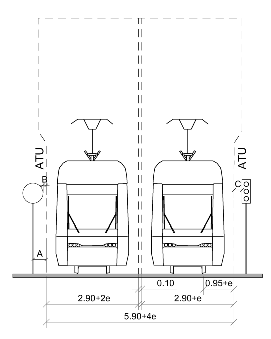 Raitiovaunun vaatima aukean tilan ulottuma suoralla radalla (kuva 1) ja vähintään 250 metrin kaarresäteellä on leveyssuunnassa 2 900 mm. Jos kaarresäde on alle 250 metriä, ATU:a on levennettävä, jolloin rata-alueen vaatima tila ja raideväli kasvavat. Levennystä merkitään kirjaimella e ja se on kuvattu kohdassa Aukean tilan ulottuman leventäminen kaarteissa.