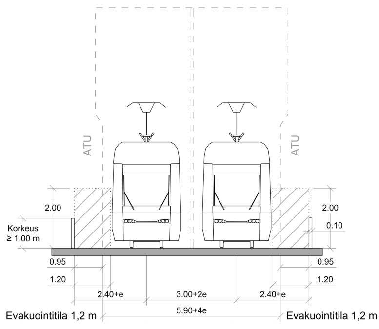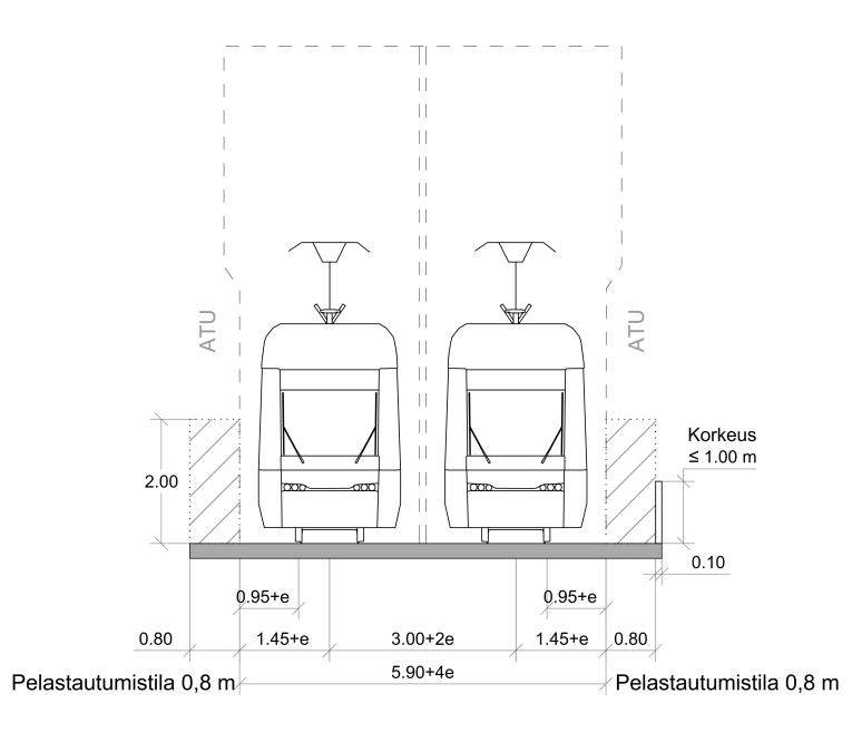 Etäisyyden ATU:sta jatkuvaan kiinteään esteeseen tulee olla vähintään 0,8 m. Tämän lisäksi tulee huomioida mahdollinen evakuointitila luvun Raitiotien tilavaatimukset kohdan Evakuointitila mukaisesti. Korkeintaan 50 cm korkeisiin esteisiin voidaan soveltaa matalien kaiteiden ja aitojen ohjeita.