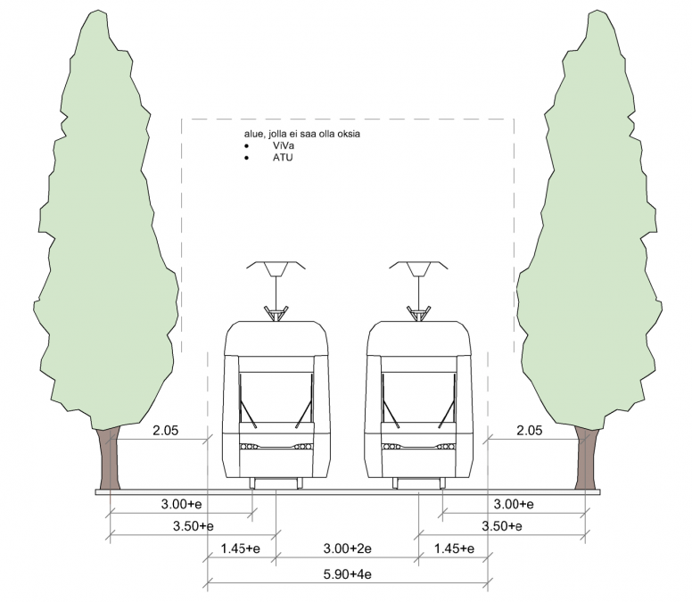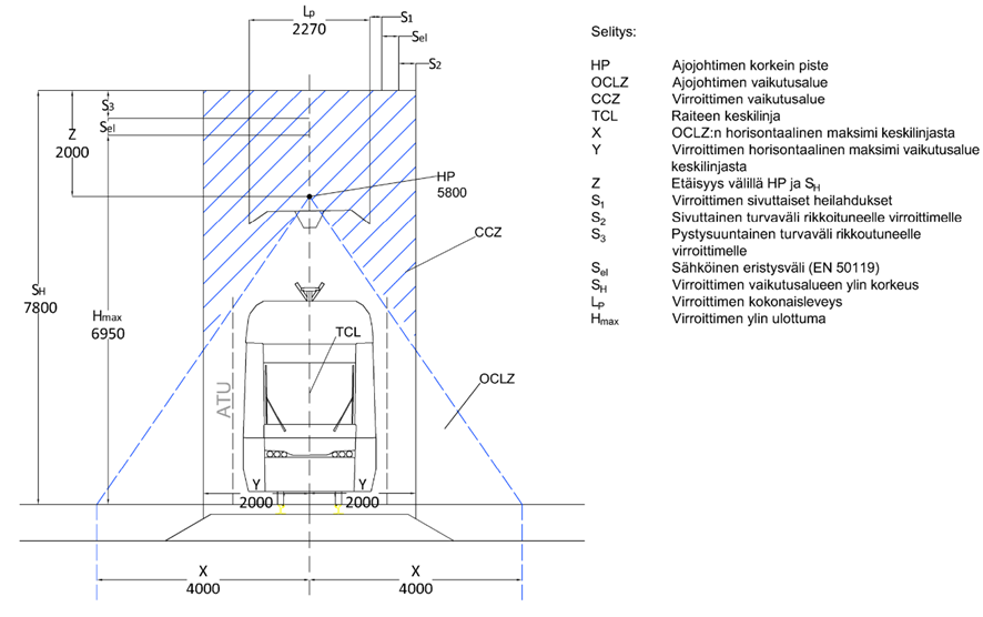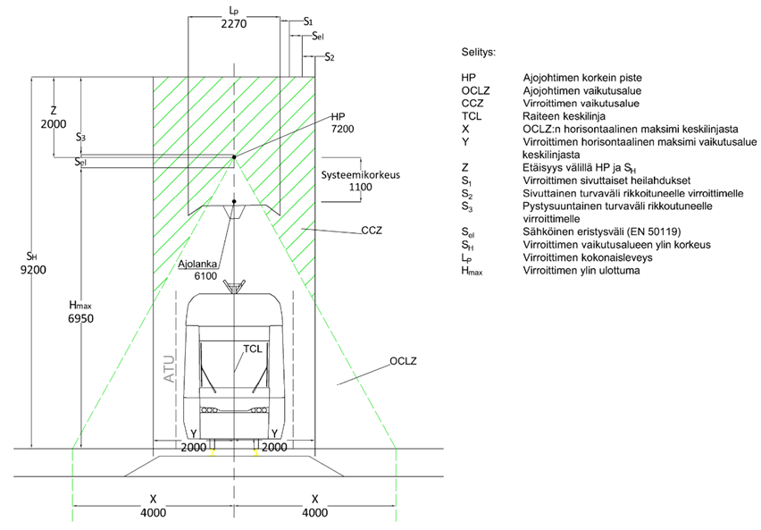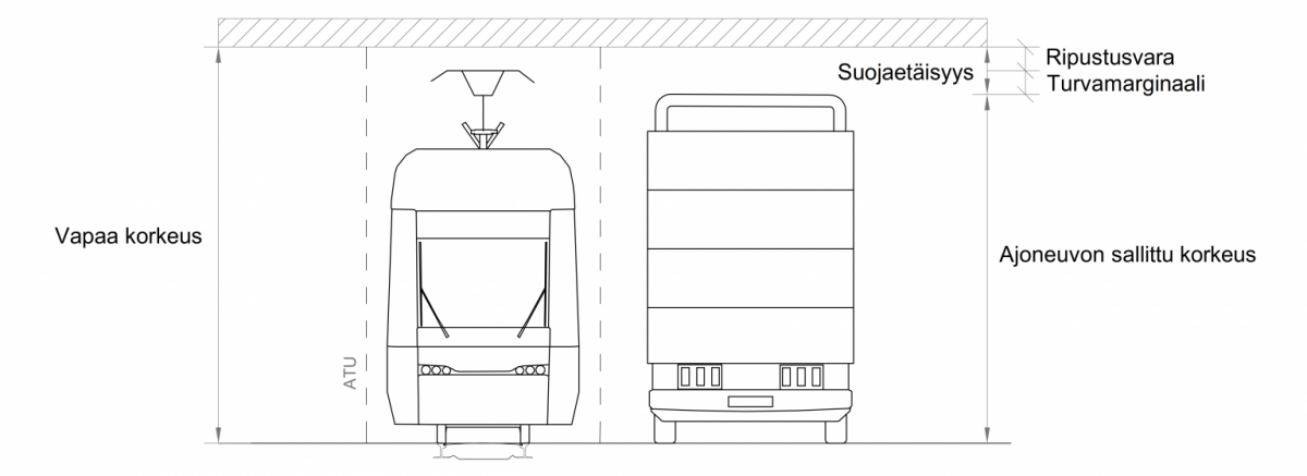 Aukean tilan ulottuman lisäksi raitiotien tilavaatimuksia määrittää virroittimen vaara-alue (ViVa) (kuvat 2, 3 ja 4 rasteroitu osuus). ViVan leveys on 2 000 mm raiteen keskilinjasta eli kokonaisleveys on 4 000 mm. Virroittimen vaara-alueen korkeus vaihtelee riippuen ajojohtimen rakenteesta. Pikaraitiotieverkolla kannattimellisessa rakenteessa ViVa:n korkeus kiskonselänkorkeudesta on 9 200 mm ja kannattimettomassa rakenteessa 8 100 mm (kuvat 2 ja 3). Kantakaupungissa vastaava korkeus kannattimettomalle rakenteelle on 7 800 mm (kuva 4).