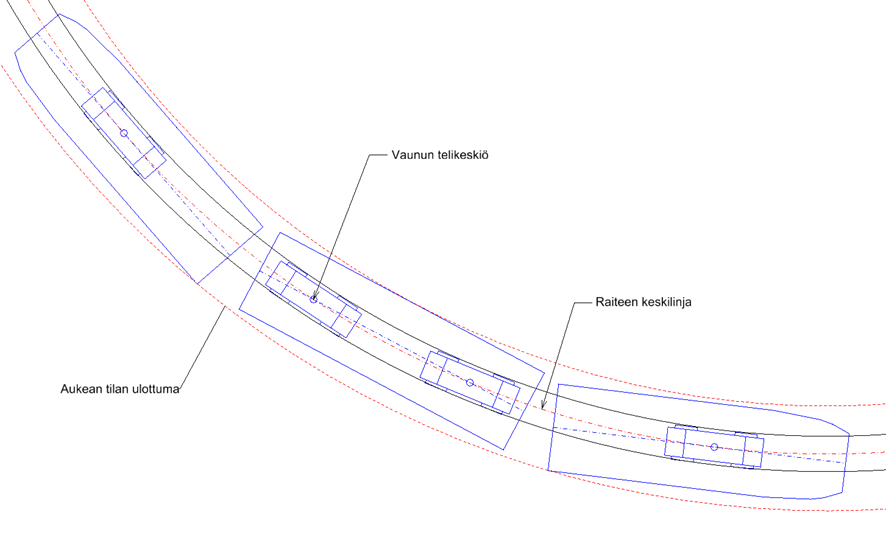 Raitiotien aukean tilan ulottumaa (ATU) levennetään kaarteessa vaunun kulmien ja keskiosan ulosheiton huomioimiseksi (kuva 9). Kaarteen aiheuttama levitys ATU:n puolileveyteen merkitään e. Kallistetussa raiteessa on lisäksi huomioitava vaunun kallistumisesta aiheutuva levenemä bH.
