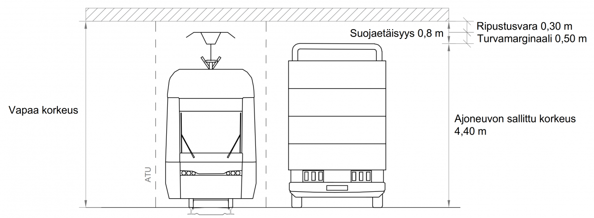 Raitiotien yläpuolella olevien rakenteiden normaali vapaa korkeus on 5,2 m. Normaali korkeus mahdollistaa 4,9 m ajolangan korkeuden tyypillisellä 0,3 m ripustusvaralla, jolloin 4,4 m korkea ajoneuvo voi käyttää samaa kaistaa raitiotien kanssa (kuva 19).