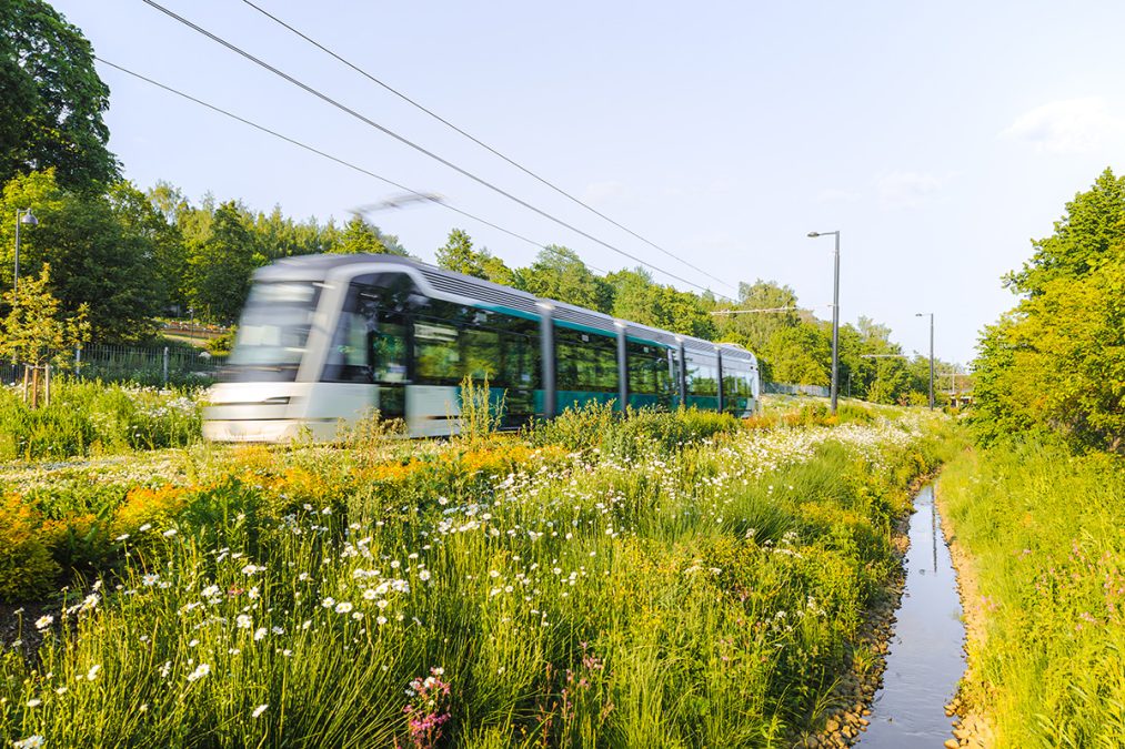Ny infrastruktur för spårtrafiken och inköp av materiel genererar dock betydande koldioxidutsläpp, och att minska dem står i centrum för vårt miljöarbete. Genom att fokusera på resurseffektivitet och cirkulär ekonomi minskar vi inte bara utsläppen utan även användningen av naturresurser. Nya spårvägar och depåer byggs också ofta i det som tidigare varit grönområden, men vi tar hänsyn till naturvärdena i våra projekt. Vi strävar efter att öka stadsgrönskan i den befintliga infrastrukturen, till exempel med hjälp av gröna tak och väggar.