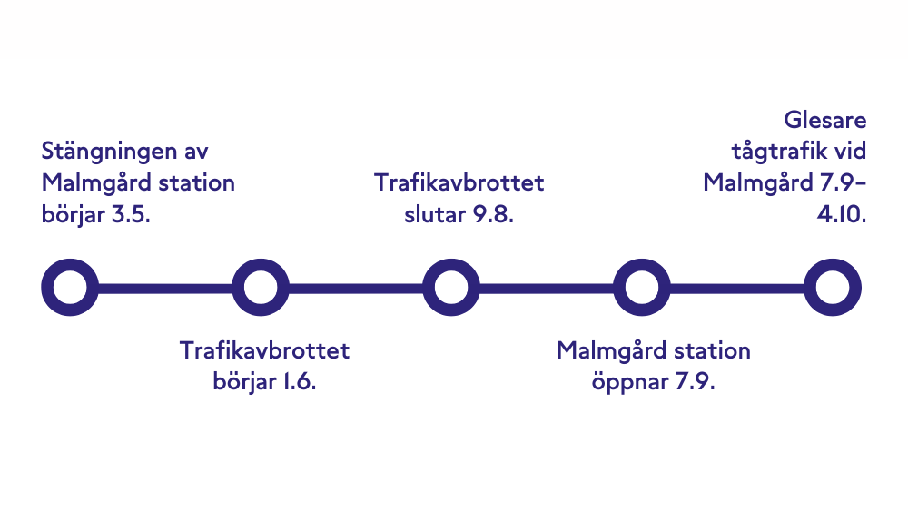 Trafikavbrottet pågår 1.6–9.8., under vilket inga tåg trafikerar Malmgård, Norra Haga eller Gamlas stationer. Tågen stannar då i Hoplax och Myrbacka.