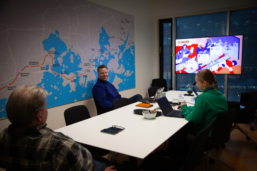 Tiistait ja torstait ovat METKAlla yleensä toimistopäiviä. Jeren torstaihin kuuluu lähes aina liuta palavereja – mutta tämän turkulaisen hymy on työmäärästä huolimatta herkässä. Pulkkisen hersyvän naurun kuulee METKAn projektitoimiston toiseen päätyyn asti.